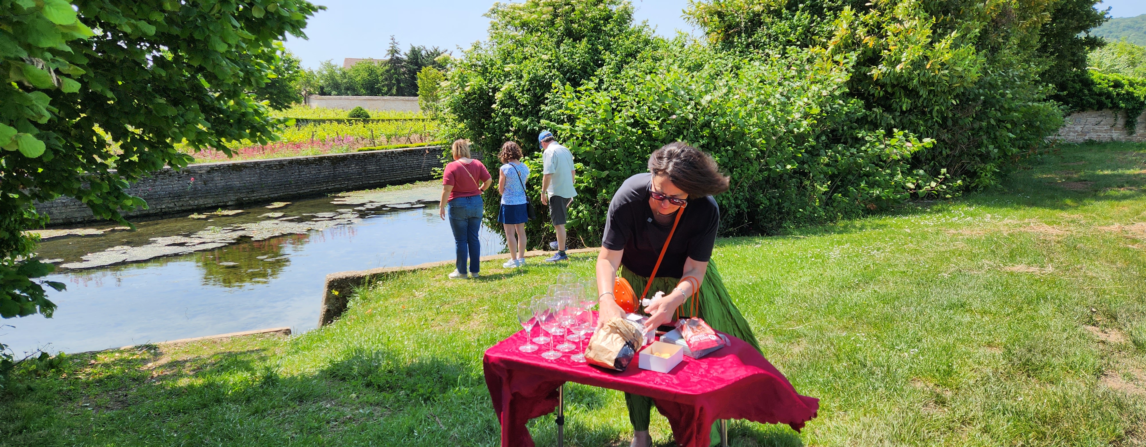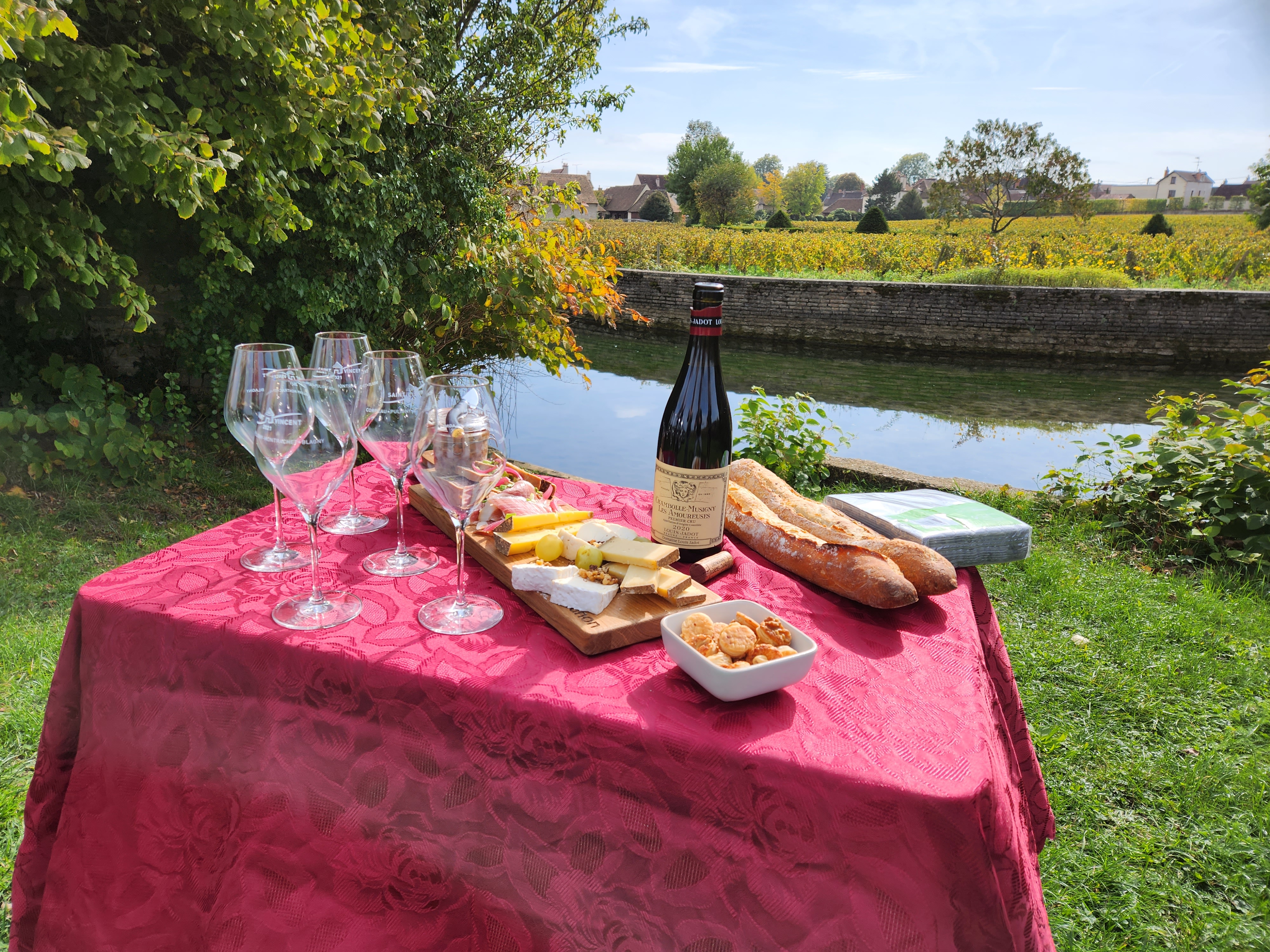 Dégustation d’un 1er Cru « Les Amoureuses » au bord de l’eau, à quelques mètres de la vigne qui porte son nom, avec pain, charcuterie et fromage à la truffe